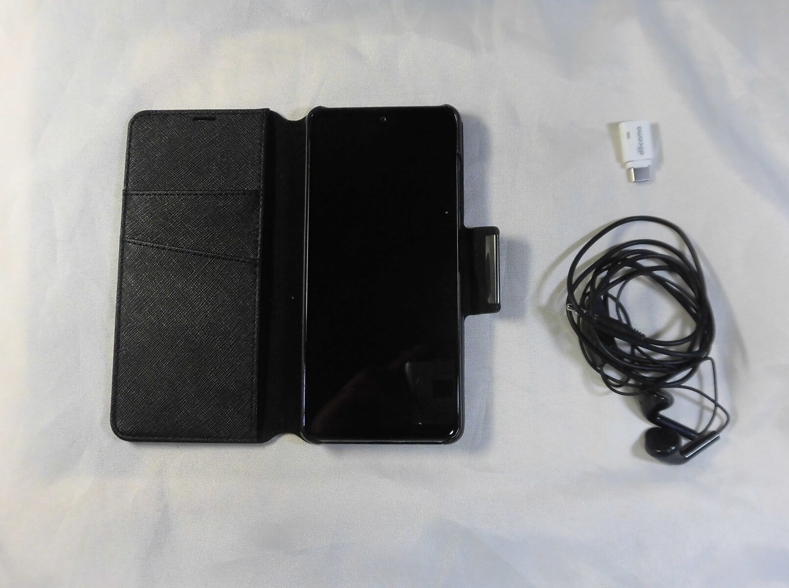 写真の左側が、手帳型ケースに入ったスマホ(共にブラック)、右下がイアホン、右上がケーブルのタイプB→タイプCへの、変換アダプタである。アダプタは小さいので紛れやすく、置く場所を決めて収めてある。