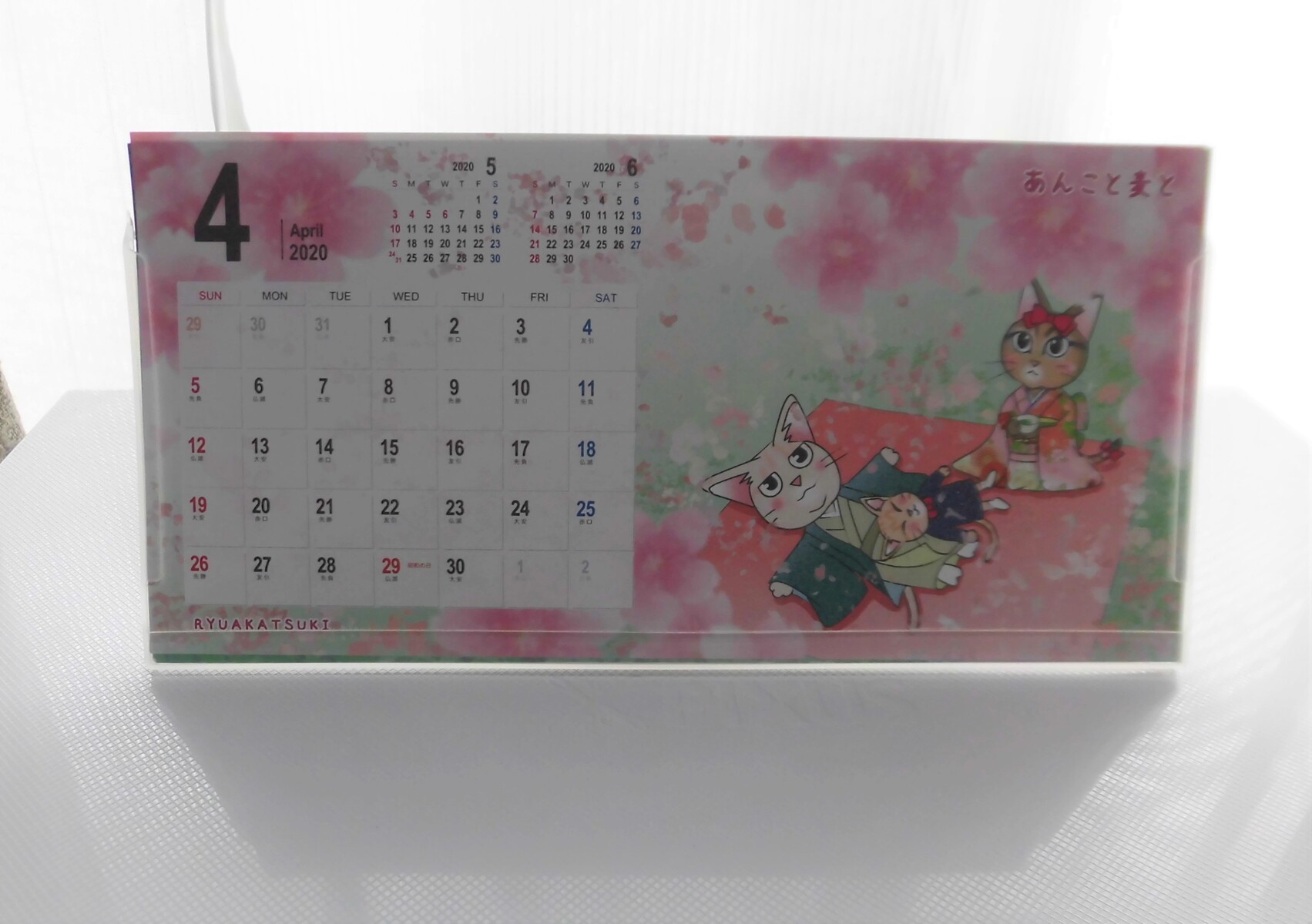 プロ・マンガ家、「あんこと麦と」のブロガー、インスタグラマー(フォロワー・3万3千人)等としてご活躍の、暁龍さん(あかつきりゅうさん)が昨年末に、メルカリで頒布の卓上型カレンダーより、4月分です。ふだんはプリンタの上に置いています。